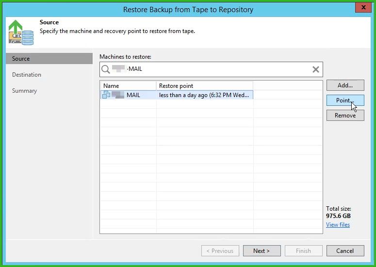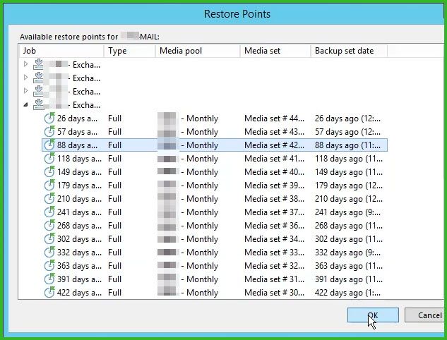 Select the Exchange server VM and then click on the Point button to select the restore point.