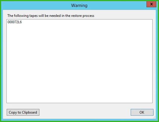 I then got this warning, this happened as the required tape is no longer in the tape library. What’s nice here is it tells you exactly what tape(s) you need from the media pool, in this case the media had been moved to an offline vault. The media set contains 3 tapes so I know which tape to retrieve. I could also work this out by looking at the properties of each tape in the set and see which one has the Exchange VM on it.
