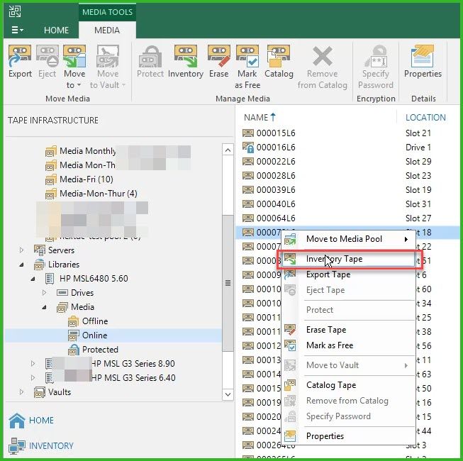 In this case I was putting the tape in to a different tape library to do the restore, so once it was in there the “inventory Tape” command needs to be run so that Veeam recognises it.