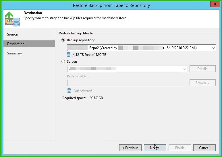 Once the tape inventory has finished, go through the restore process again and after selecting the restore point you will proceed to the destination screen. Select an appropriate destination.