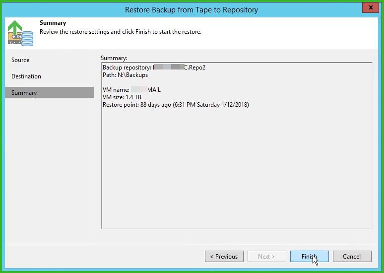 Check the summary screen and make sure everything this is correct and then click Finish to start the restore process.